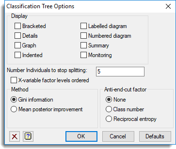 The effectiveness of a factor or variate to be chosen at each node depends on how the groups are split between remaining subsets. This option lets you choose the method to assess this. You can select either the Gini information criterion or the Mean posterior improvement criterion.