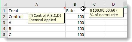 If the data for a factor within Excel has the actual levels or labels specified then the cell comment can be used to specify the order of these to be used in Genstat. For example, if a column contained a factor with labels AR1, AR37, Nil and Wild, then by default these would be read into Genstat in alphabetical order. Using the cell comment these could be given an alternative order such !T(Nil,Wild,AR1,AR37). Similarly if a column contained a factor with levels 0.5,1,2,10 then a reordering such as !(10,2,1,0.5) could be used to specify the levels should be stored in decreasing order.