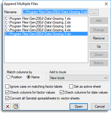 | Filename | Lets you select which files to append. For multi-paged Genstat books (GWB) or Excel files, you will be prompted for each of these files in turn to select one or more of the sheets within the file to append. The files are appended in the order that they are displayed in the list. The following buttons can be used to add, remove or change the order of the files in the list. Add – add the file in the Filename field into the list of files. Change – replace the selected the file in the list with the name in the Filename field. Remove – remove the selected file from the list. Up – move the selected file up one place in the list. Down – move the selected file down one place in the list. Bottom – move the selected file to the last place in the list. |