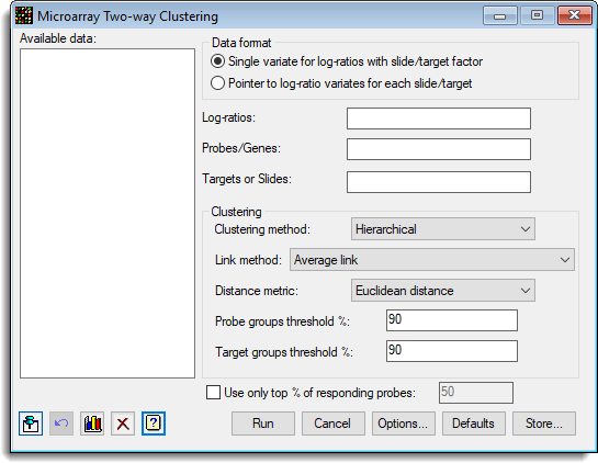 The dendrogram for a hierarchical cluster analysis may be plotted, but for a large number of probes this may not be useful as individual probes cannot be read. The responses of each probe across the targets/slides can also be plotted, but again with large numbers of probes this is slow, in which case the mean response for each group can be plotted. A spreadsheet containing the grouped data can also be generated using the Store button.