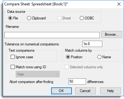 When the File option is selected for the Data source this provides a space to specify the name of a file to be compared with the current spreadsheet. You can navigate for a file by clicking the Browse button.