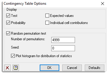 Number of permutations lets you specify the number of allocations.Seed lets you specify a randomization seed. Plot histogram for distribution of statistics produces a histogram showing the distribution of statistics obtained from the permuted data sets. A visual indication of the chi-square statistic from the observed data is superimposed on the graph.