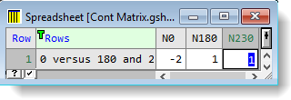 When we click OK, a Genstat spreadsheet opens containing the contrast matrix Cont whose name was specified in the Contrast matrix field; this name was selected automatically by the ANOVA Contrasts menu, but you can specify your own name if you prefer, or if you have already formed a suitable matrix. You use the spreadsheet to specify the coefficients that define the comparison. In the Figure below the matrix defines the comparison: N0 vs (N180 + N230)/2.