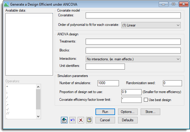 A formula giving the block structure to be fitted in an analysis of covariance (ANCOVA). The formula is made from a list of factors combined with formula operators. You can enter factors from the Available data list by double clicking their names, and similarly the operators can be entered by double clicking the entries in the Operators list.