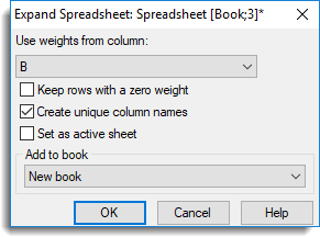 If values within the weight column are not integers the values will be rounded to the nearest integer. If a weight value is less than zero or a missing value then no copies of that row will appear in the new spreadsheet. If a weight value is zero, then rows will only be copied if the Keep rows with zero weight option is selected. This menu is useful for when an analysis does not have a WEIGHTS option, and the data have been supplied in a weighted format. You can then use the expanded spreadsheet to perform the equivalent of the weighted analysis.
