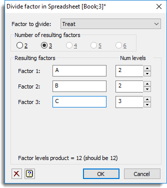 The dialog calculates the divisors for the number of levels in the factor being divided and then these are used to initialize the fields for the number of levels of each factor. If the number of levels does not have enough divisors, then the dialog will not let you specify that number of resulting factors. For example if the number of levels is 12, then at most only 3 factors can be formed as 12 has prime divisors of 2, 2, and 3. If the number of levels of a factor is prime, then a warning will be provided, as this factor may not be divided. The resulting factor columns are added back to the spreadsheet containing the original factor.