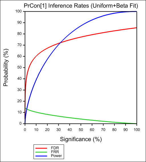 The false discovery rate (FDR), false rejection rate (FRR) and power of a test by modelling significance values as a 2-component mixture of Uniform and Beta or Gamma densities, Allison et al. (2002) are estimated. The context is multiple testing, with data from any situation where the same simple hypothesis, Ho, is tested many times, such as in transcriptomics (microarrays), metabolomics and proteomics. These tests generate a large number of significance values which, under H0, have a Uniform distribution and, under Ha, can be modelled as a Beta or truncated Gamma density. The parameters of this mixture distribution to derive the False Discovery Rate, Prob(H0/Da), the False Rejection Rate, Prob(Ha/D0) and the Power of the test, Prob(Da/Ha), each as a function of pcrit are estimated. Here Da denotes the event “p<pcrit”.