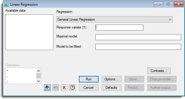 Specifies the model to be fitted by entering a model formula. The formula can involve both variates and factors which can be selected from the Available data list, and operators from the Operators list. A variate in the formula represents its linear effect, and a factor represents its main effect: that is, a separate intercept for each level of the factor. An interaction between factors allows separate intercepts for each combination of levels of the factors. An interaction between a variate and a factor represents separate slopes for each level. You can also include interactions between variates, representing the linear effect of the product of the two variates, and interactions between any number up to nine variates and factors.