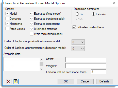 Use this to set options and select the output to be generated by Hierarchical Generalized Linear Model analysis.
