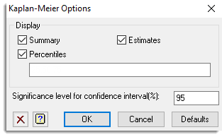 | Percentiles | Estimates quantiles of the distribution of survival times (observed time points only). Provides a space to enter a list of percentiles separated by commas (e.g. 25,50,95). |