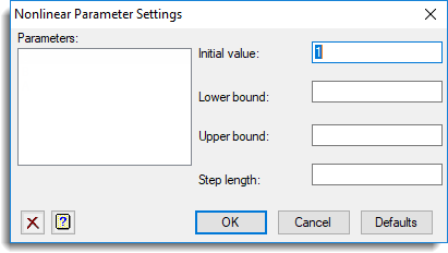 Lists all the nonlinear parameters currently specified in the Nonlinear parameters field of the Nonlinear Models dialog. Select the parameter that you want to enter the new settings for.