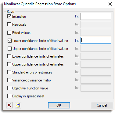 This dialog lets you save results from a Nonlinear Quantile regression. These results are saved when an analysis is run and must be specified before running an analysis.