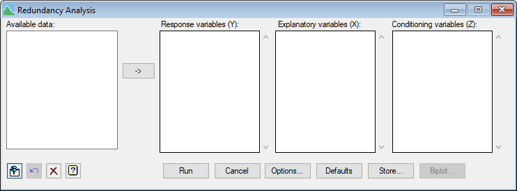 Partial redundancy analysis can be performed by supplying a set of conditioning variables, where the effect of the conditioning variables is removed before performing the redundancy analysis. This may be useful in cases where the effects of the response and conditioning variables are well known, or you may wish to isolate the effect of an individual explanatory variable (in which case you would specify all but one of the explanatory variables as the conditioning variables).