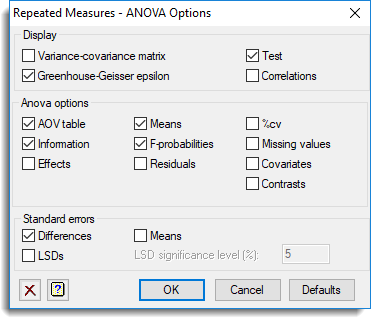 When printing tables of means you can specify the form in which standard errors will be displayed: as standard errors of the means, standard errors of differences (SEDs), or least significant differences (LSDs). If required, you can display more than one type of standard error. The significance level for LSDs can be specified as a percentage (default 5) in the accompanying input field.