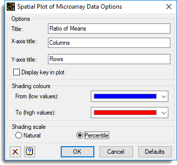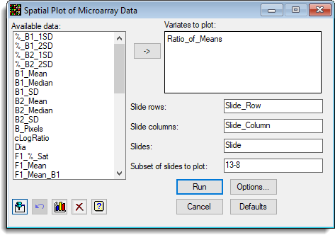 | Defaults | Reset options to their default settings. Clicking the right mouse on this button produces a shortcut menu where you can choose to set the options using the currently stored defaults or the Genstat default settings. |