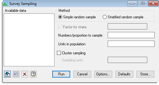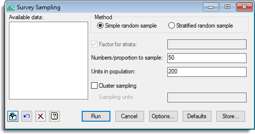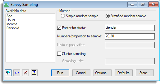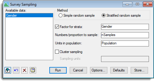 | Stratified random sample | This generates a stratified random sample, which has independent simple random samples taken within each stratum. Normally a factor is entered in the Factor for strata field and this factor is used for the strata. A list of numbers separated by spaces or commas can be entered in the Numbers/proportion to be sampled, and the number of entries must match the number of levels in the Factor for strata. Alternatively a variate with the length equal to number of levels of the Factor for strata, or table with the Factor for strata as its classifying factor can be entered. If the Factor for strata is not defined for the population, then you also need to define the Units in population field.
