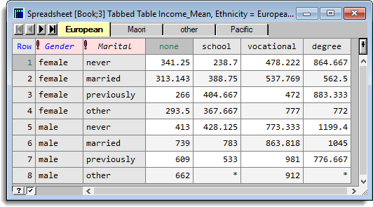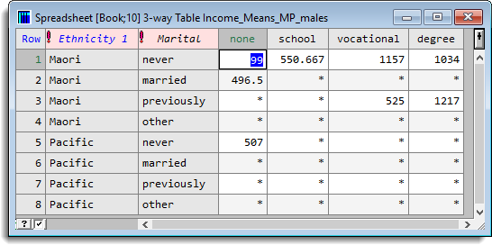 The table of mean incomes by the four factors can be sliced to look at Pacific males. We can select two slices, one with just males selected for Gender and the other with Maori and Pacific selected for Ethnicity.