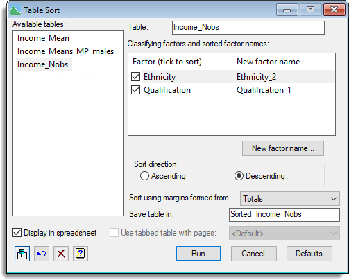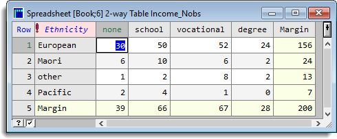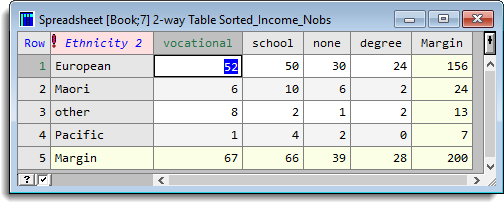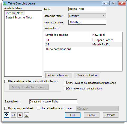 Using the Ethnicity x Qualification table above (Income_Nobs) we may want to produce a summary combining certain of the factor levels. We can create a table as follows: