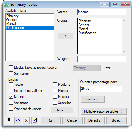 Setting up the dialog as shown below enables us to form cross tabulated means over all of these combinations.