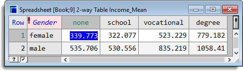 Table 1. Created as the means of the variate Income grouped by Gender and Qualification.