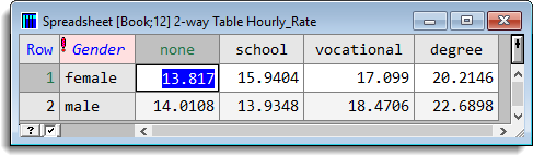 Then we can calculate the average income per hour for the groups by entering the calculation as shown in the Table Calculations dialog shown below (select Data | Calculations). Here we’ve filled it in to calculate the average pay rate of individuals in the survey by Gender and Qualification and to display this in a spreadsheet as in Table 3 below.