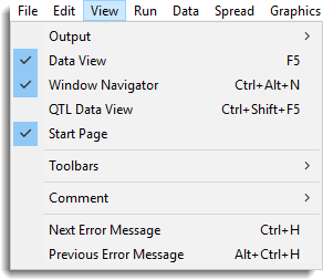 Activates the QTL data view that is docked on the left-hand side of the interface. The QTL data view provides a display of all the data structures that are currently available within QTL data space. If this window is open, then the menu item will be ticked and selecting the menu item again will close the window.