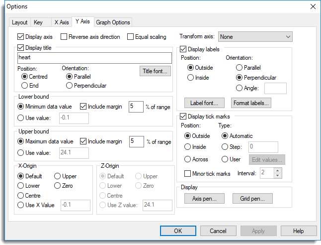 The X, Y or Z Origin determines the values on the x,y or z-axis through which the axis is drawn. If the value is outside the axis bounds, the upper or lower bound is adjusted so that the axis will extend up to the specified origin. This applies whether you have set the bounds explicitly or have left Genstat to calculate them from the data. By default, the lower bounds of each axis are used, so that the axis is drawn at the bottom of the plot. This option is not available for the x-axis of bar charts.