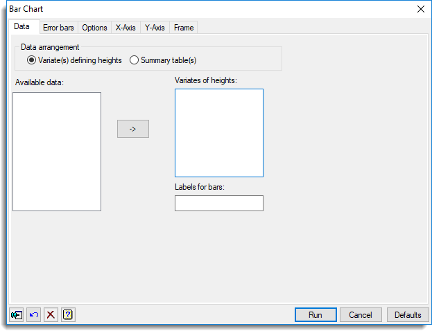 Specifies summary tables containing the heights for each bar to be displayed in the bar chart. You can supply one or more one-way tables or a single two-way table. If several one-way tables are supplied then the tables must all be classified using the same factor. For a two-way table or multiple one-way tables the representation of the multiple bar charts can then be set in the Options tab where they can either be displayed alongside each other or stacked. Double-click a name in the Available data field to copy