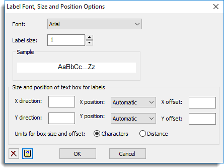 This provides options to specify the size of a box in which the label will be displayed. When a label exceeds the value of the X direction then it will wrap on the next line. The number of lines that label can wrap onto can be specified using the Y direction. Note that when the sizes are in terms of the number of characters to be displayed, any part of the label that does not fit within the box will be truncated. If the units are in terms of distance, the label will be shrunk to fit within the specified box size. If the direction fields are left empty, then there will be no limit applied to the labels.